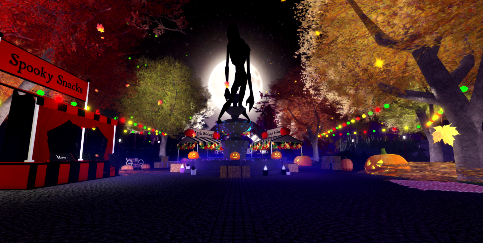 Autumn Town is a temporary realm that was accessible during Royale High's Halloween events during the years 2017, 2019, and 2020. The two versions of the realms were set up very similarly with the players being able to visit houses to trick or treat for candies, and both versions also featured a maze. Players were also able to go apple bobbing and buy exclusive autumn-themed treats from the stalls.
